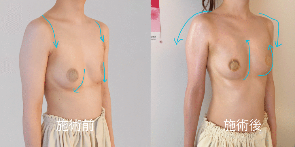 具体的には、骨盤、肩甲骨下部や大胸筋下部(基底部)、腹部や背部の皮膚に至るまで、身体全体の調整を行い、バストサイズの最大化を実現します。